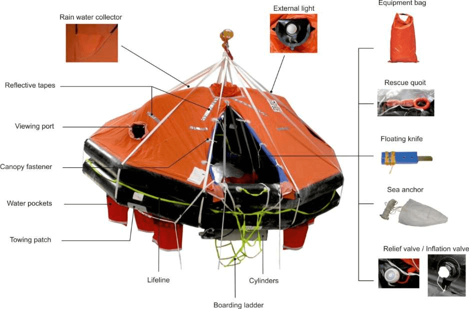 - Equipment packs sealed in strong watertight bags, secured inside the liferaft